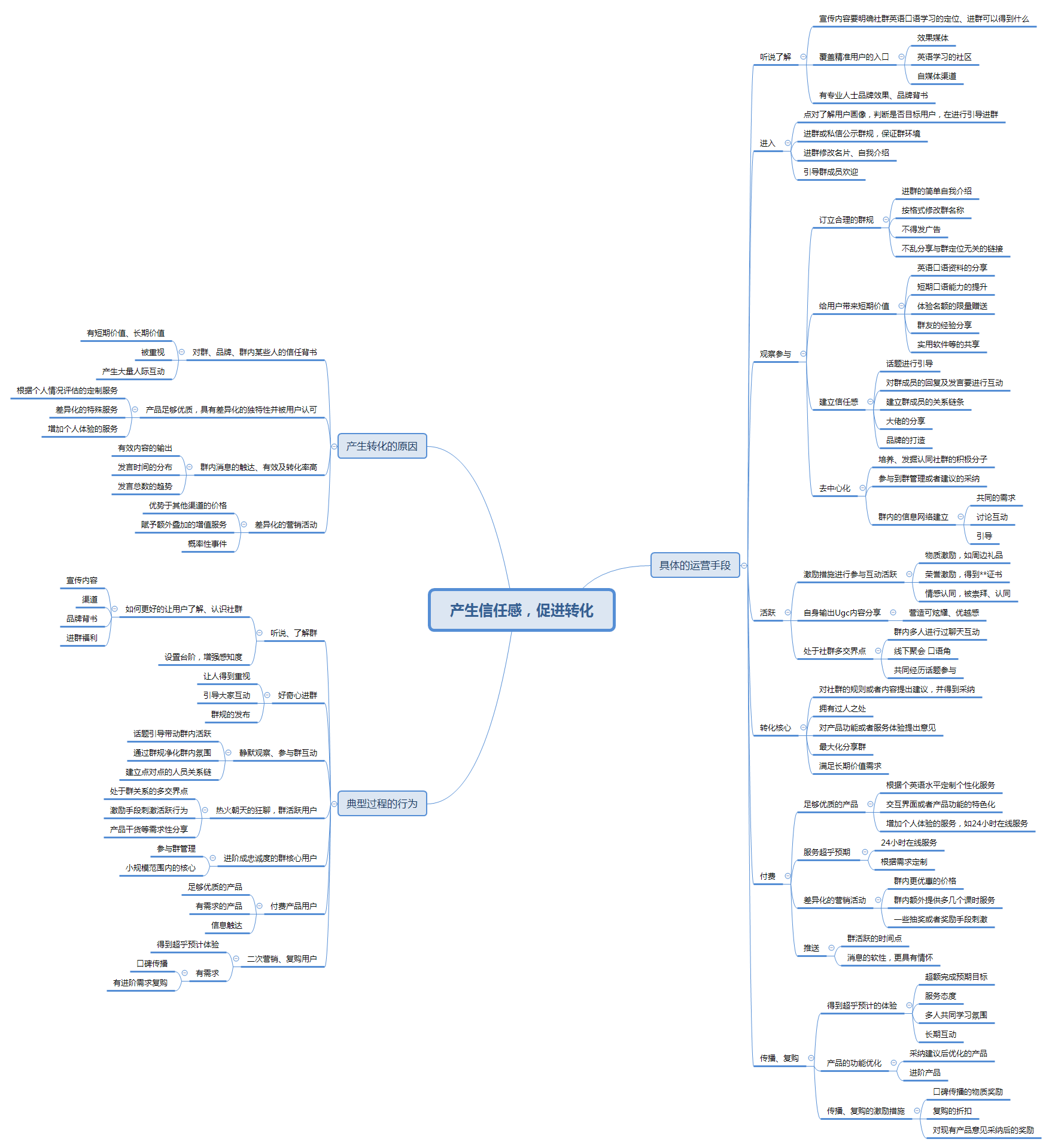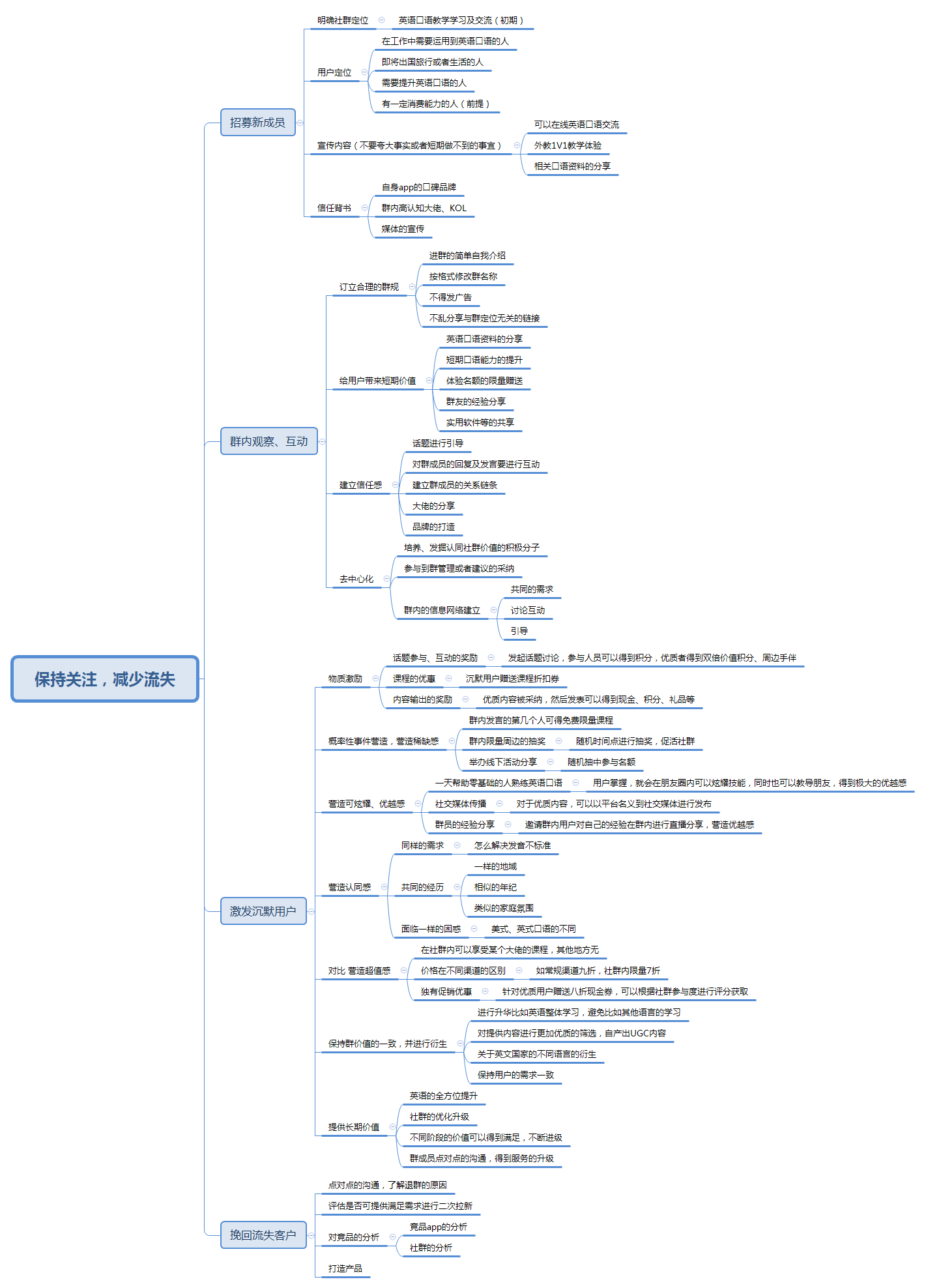 本图展示的微信群的一个正常用户行为流程,普通用户-活跃用户-核心用户-流失用户,同时包含在各个阶段用户自身行为的特征或者导致此行为的原因。