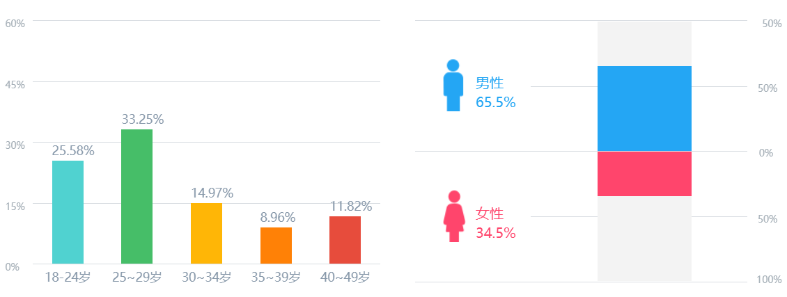 - 24-35 岁的主流人群,男性粉丝占比较大