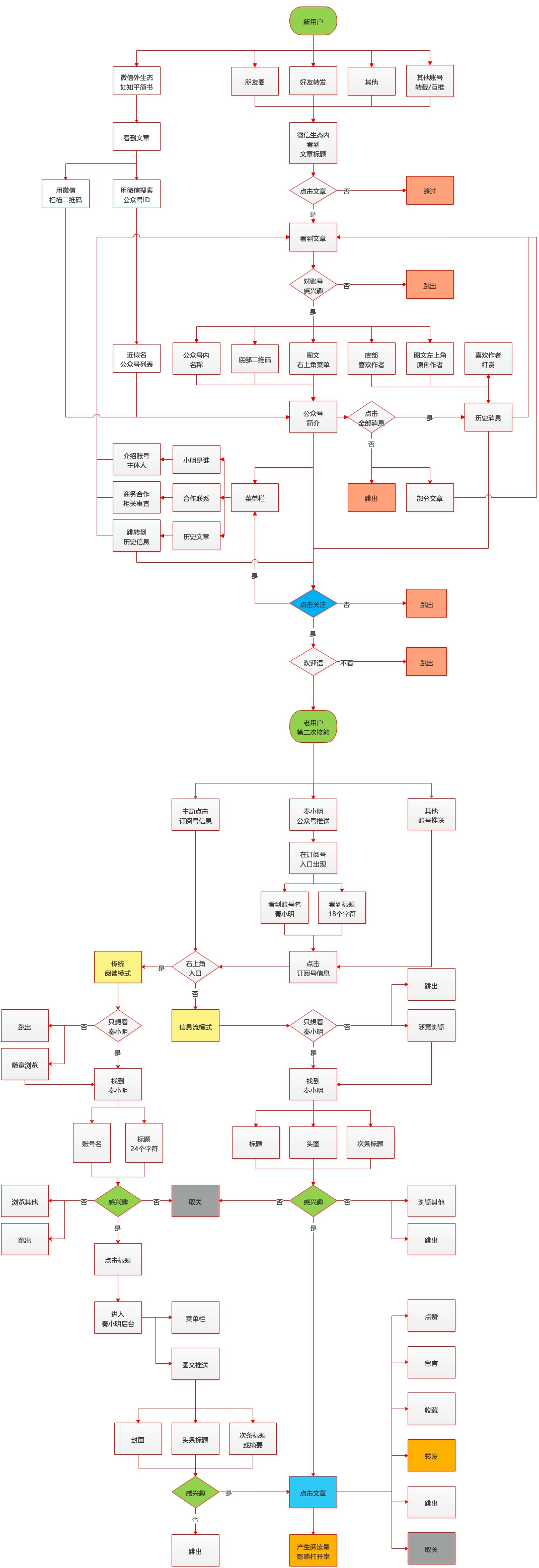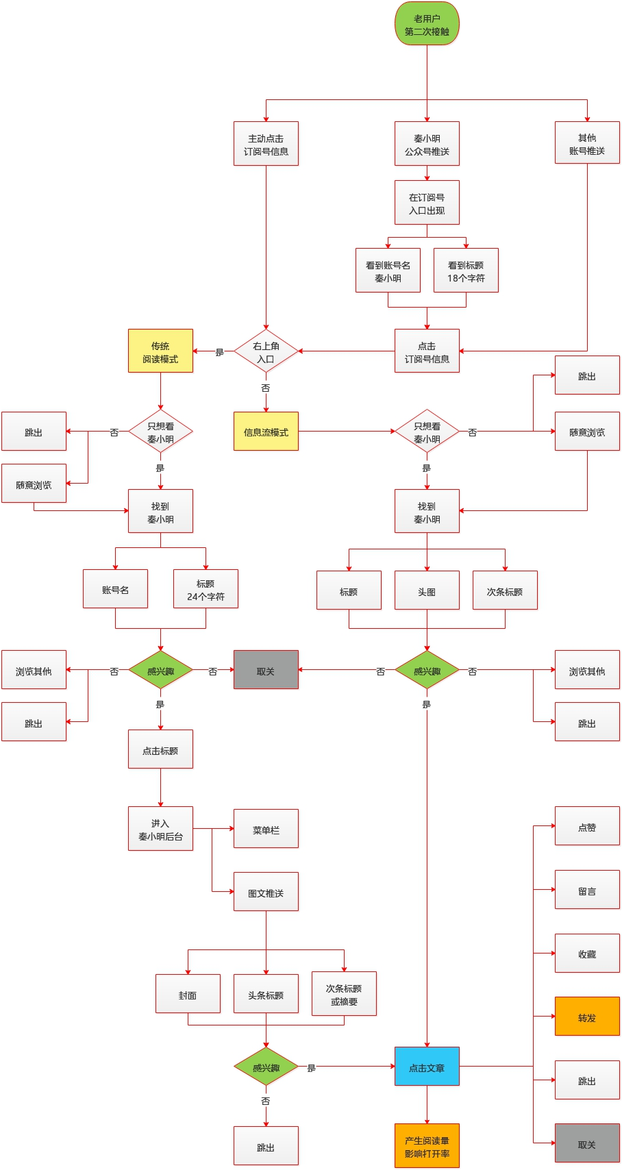 通过老用户地图路径图包含了「传统阅读模式」&「信息流阅读模式」,通过上图的左右对比,可以很直观地看出,在信息流模式下,用户从「订阅号入口」到「点击文章阅读」的这一路径明显缩短了很多。