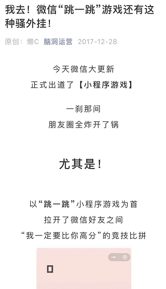 这是2017年的一篇热点类文章,是微信跳一跳小游戏的高分攻略,全文仅332个字,在推送当天吸粉2k+,推送七天内,斩获了11.8w+阅读量,阅读率53%,六百余条评论。截止今日已经有40w+的阅读量。热点类的爆文需要时机+敏感度+idea。