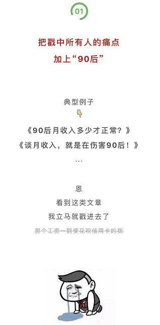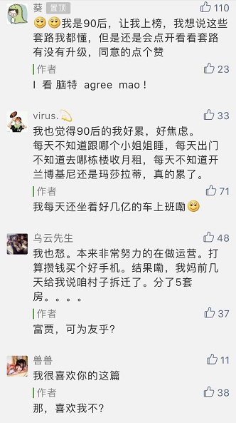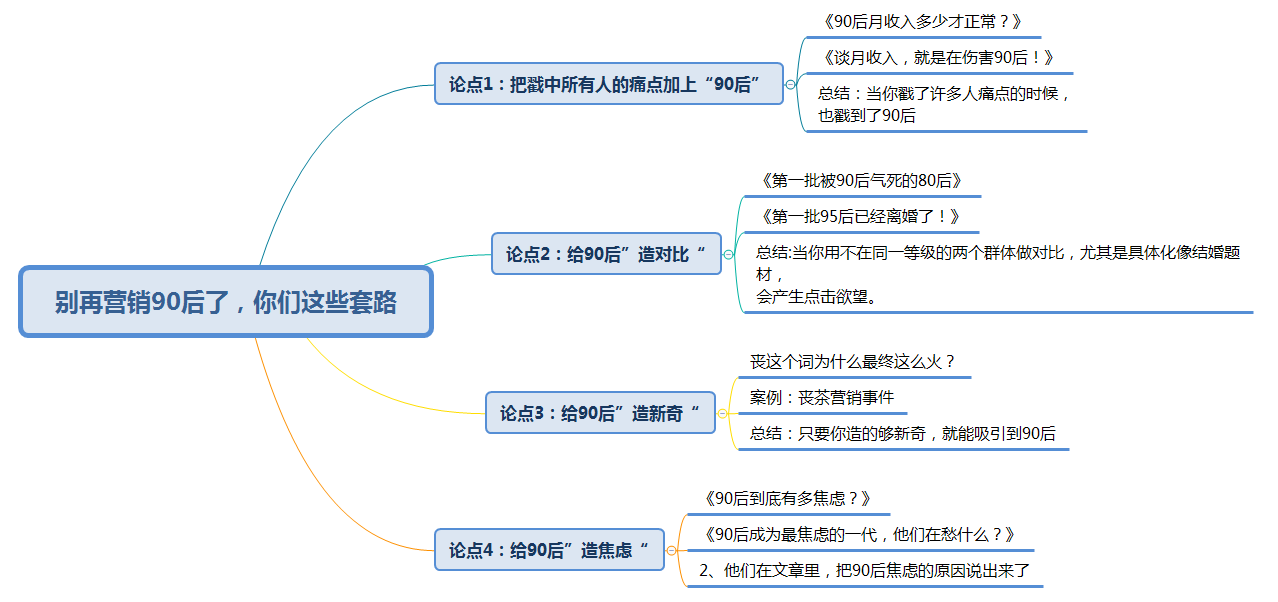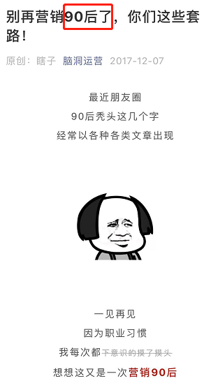 《别再营销90后了,你们这些套路》是一篇以90后为话题的文章,从“痛点加上90后”“造对比”“造新奇”“造焦虑”一共获得19347条阅读量,205条评论。