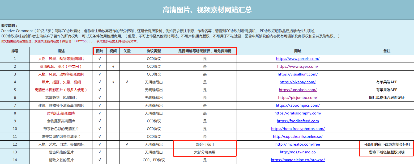 以脑洞分享的非商用的素材网站汇总为例,每一个网站的版权协议、素材分类、注意事项,运营人员都会一一去核实,这样用户去使用的时候就不会再有疑虑,对你才会有信任感。在分享的素材上注明公众号名称,能让资源在传播的同时达到引流效果。