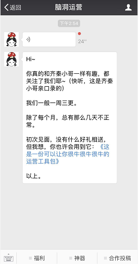 关注后,会自动回复齐秦(真的是唱歌的那个齐秦)为公众号录制的音频。利用明星效应,让初次关注的人觉得这个公众号很有逼格,并配以能表现公众号风格的文字介绍,顺便引导用户分享图文。