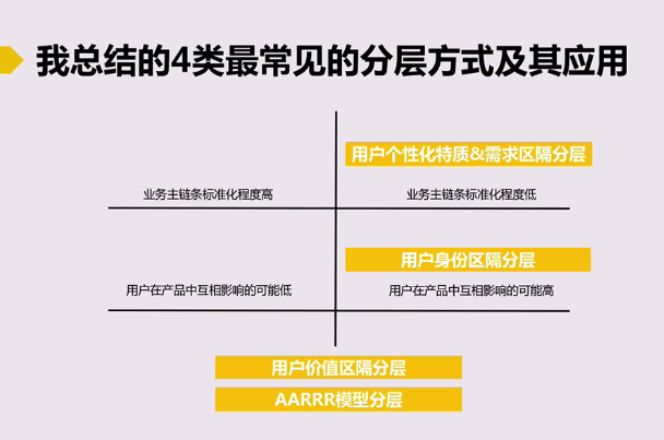 目前主要有4类常见的用户分层方式:1.用户个性化特质&需求区隔分层,2.用户身份区隔分层,3.用户价值区隔分层,4.AARRR模型分层。