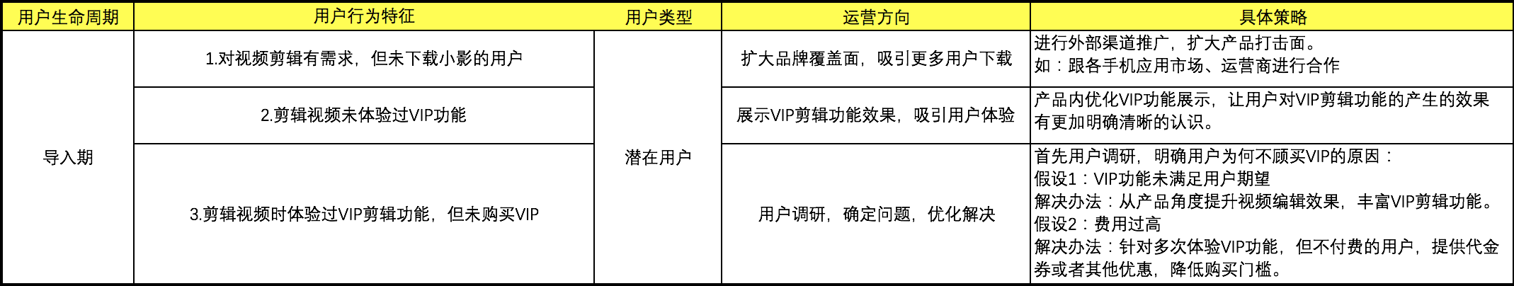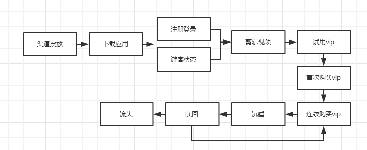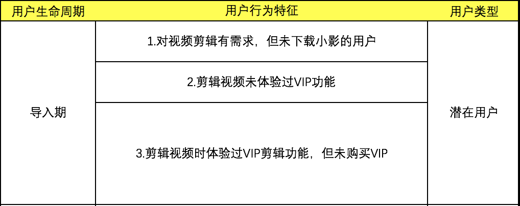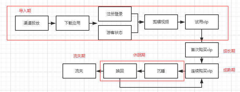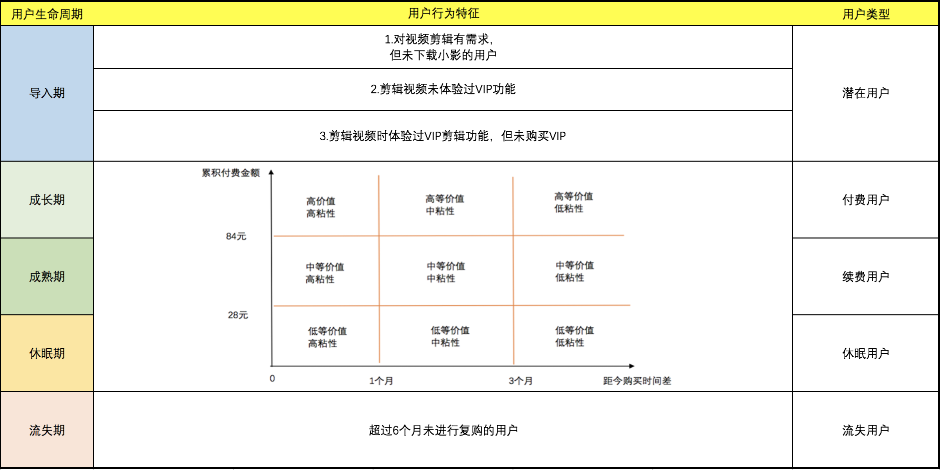因为只有付费才能成为小影的VIP会员,所以非常明确地将付费前作为用户的导入期,付费后进入成长期,若多次付费则进入成熟期,随之慢慢进入休眠与流失期。