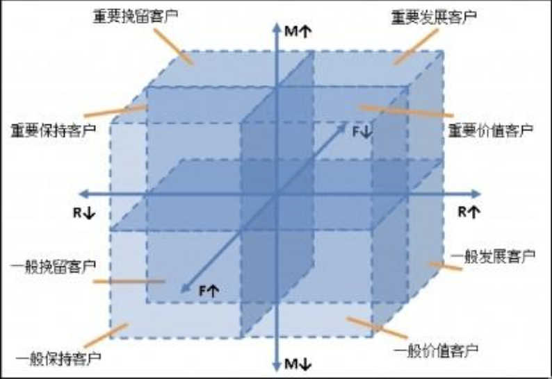 RFM模型:根据以上三个维度的指标,对用户进行交叉细分,并根据每一类细分用户进行不同的运营策略,以达到提升用户价值的目的。