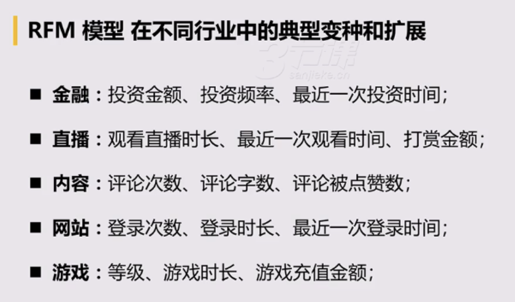 RFM模型具有灵活性,可以根据产品形态的不同,选择不同的数据维度去衡量用户价值,而且不一定非要用三个维度衡量,不同产品的用户行为具有特殊性,在选择数据维度时要结合产品具体形态,选择最恰当的数据维度去进行划分。
