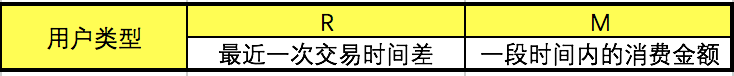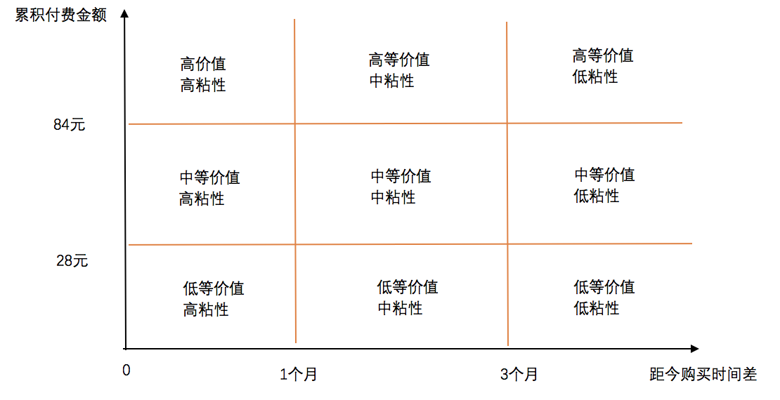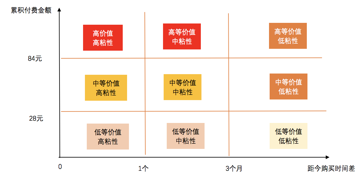 回到小影VIP的付费形态,用户购买一个月的会员能享受30天的会员服务,且在会员有效期内再进行复购的用户应该只占极少数,所以对大部分用户而言,小影的付费模式应该属于低频次的,所以在套用RFM模型时,可以剔除 F(用户一段时间交易频率)数据维度,仅用R(用户最近一次交易)和M(用户一段时间累积交易金额)去衡量用户价值。