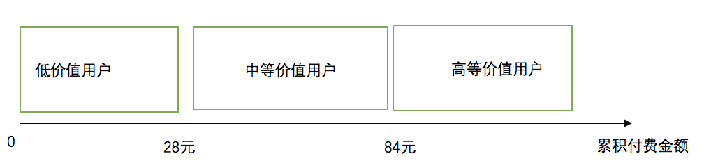 其次定义M值,因为“28元”是小影VIP的一个月的费用,所以这是一个重要值。其次根据所有VIP会员过去半年的付费金额,制作散点分布图,查看是否有明显的分布形态。假设我们通过散点图发现,有一部分VIP用户的累计付费金额密集集中在84元及以内,那84就是另外一个区隔值。