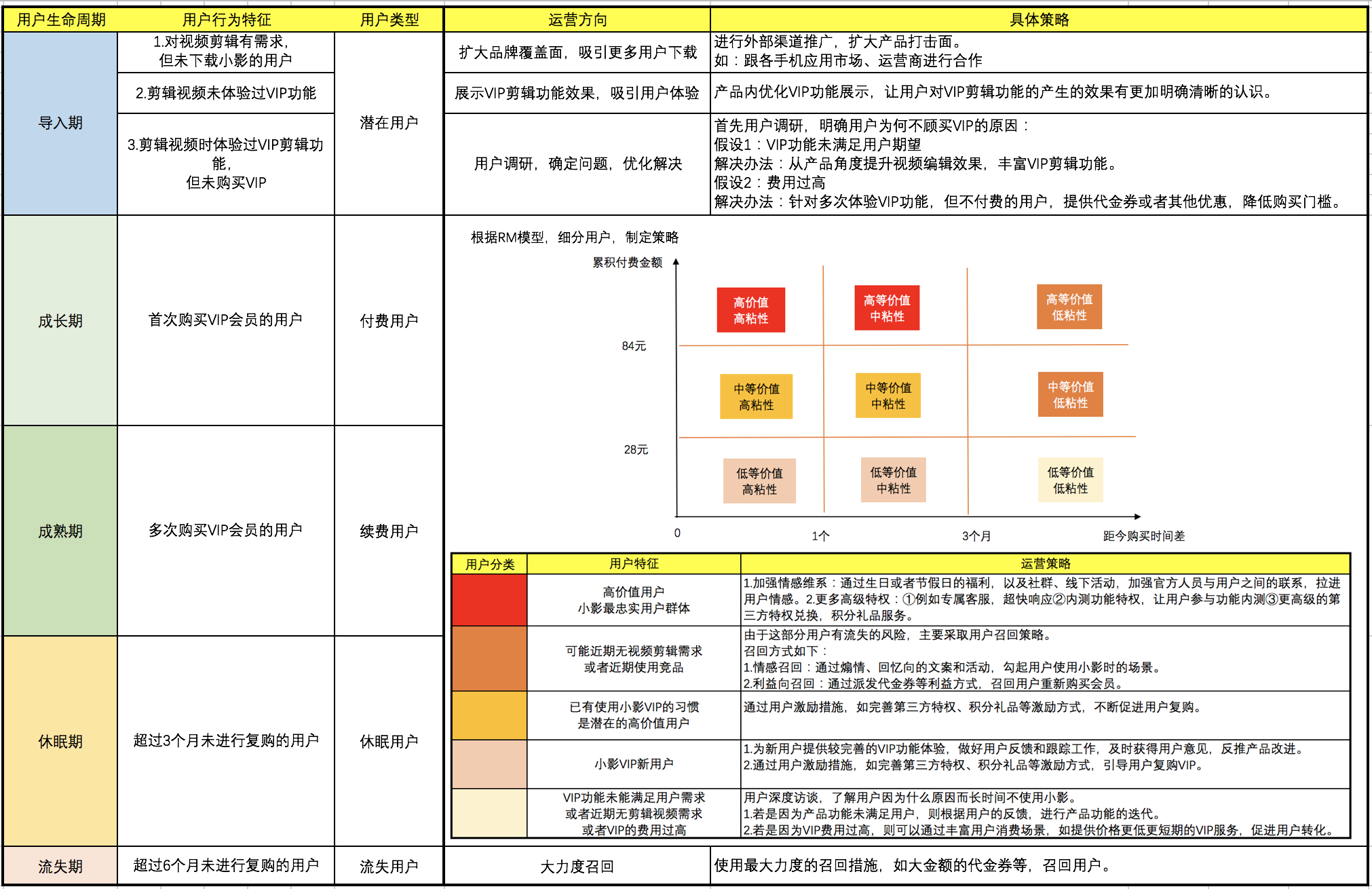 根据用户不同的生命周期与用户价值,制定不同的运营策略。