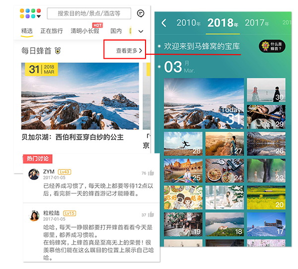 区别于其他OTA产品,马蜂窝为鼓励UGC,直接把首页置顶位留给了精彩游记(每日蜂首),甚至将功能按钮缩放至搜索栏左部。用户成为蜂首能获得一系列荣誉和特权,极大的促进了UGC社区用户的创作热情和内容产出,提升社区氛围。