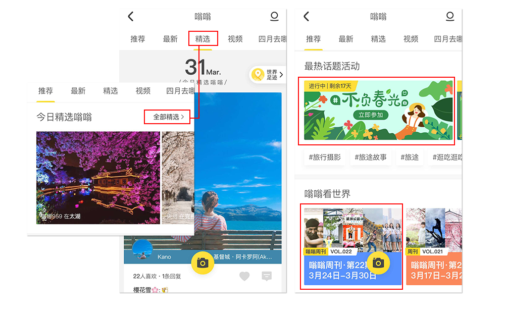从instagram得到灵感而上线的一项功能,类似朋友圈的形态和分享机制,核心是产出旅行图片。极大降低了用户的表达成本,满足了用户短时间记录旅途、分享美好的心理。同时平台也通过频繁策划主题活动、发布周刊等运营手段吸引更多用户参与。