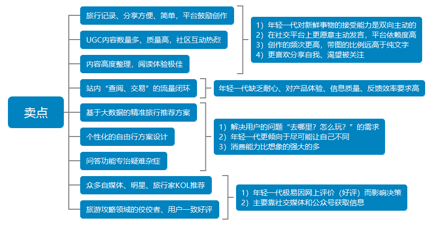 这道题给出的信息是“准备进行毕业旅行的大学生”,我理解目标用户“是已经有明确目标和动机的”,面对有明确自主的刚需的用户,相应的转化策略为“解答用户的疑惑、说服用户”。对于这样的大学生群体,逻辑上只需结构化的针对他们的问题进行详尽解答——“哪里是理想的毕业旅行目的地?怎样让毕业旅行变得更有意义、更有纪念价值?……”即可。